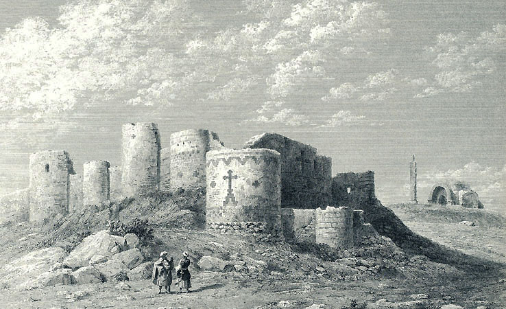 アニの都市壁 テクシエによる19世紀の絵 遠くにマヌッチ・モスクとミナレットが見える。 (From "Ani, Capitale de l'Arménie en l'An Mil" by Raymond H. Kévorkian, 2001, Paris Musées)