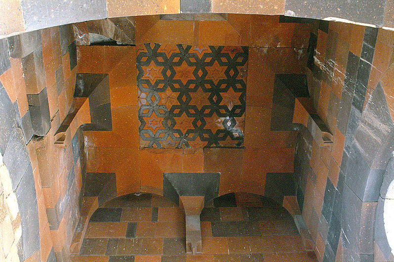 マヌッチ・モスク、天井見上げ。赤と黒の石の寄木細工による天井が印象的。