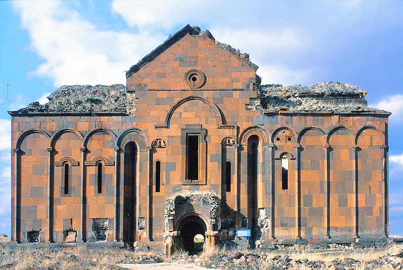 アニのカテドラル、南側ファサード。 こちら側にも入口が設けられていた。 アルメニアに特徴的な、茶色と焦げ茶色の石灰岩のランダムな貼り合わせで仕上げられている。 縦長の めくらアーケードが連続する外壁は、イタリアの ピサ・ロマネスクを連想させる。