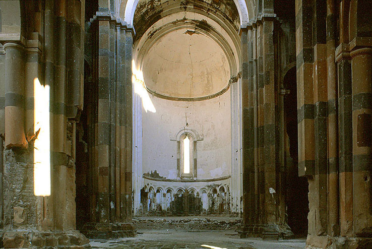 アニのカテドラルの内部。 アプスの中央に窓を設けるのが アルメニア建築の原則。 内陣の後壁には10のニッチがあり、ブラインド・アーケードが枠取りをしている。 アプスの半ドームには壁画のあとが残り、13世紀のものと推定されている。