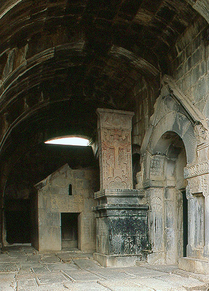 ハグバト修道院、聖ヌシャン聖堂と図書室の間の ギャラリー 右側が、聖ヌシャン聖堂の、後から作られた北入口で、堂々とした作りである。 その前面に、アメナプルキチュのハチュカルが設置された。 左の通路の突き当りが、マテナダラン(図書室)の入口。