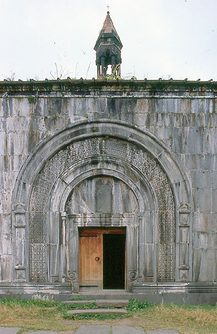 ハグバト修道院の 聖ヌシャン聖堂のガヴィット、正面 屋根の上に ロトンダ風屋根が立っているが、鐘楼ではない。 扉口の上には何重ものアーチが架けられ、 無地に見えるアーチとタンパン(ティンパヌム)には 文字列が刻まれている。