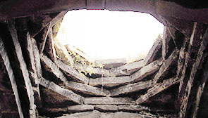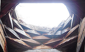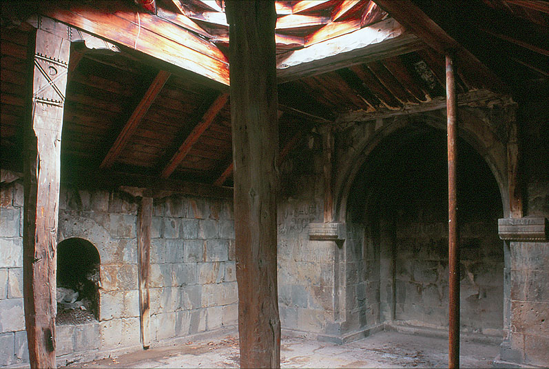 ハグバト修道院の厨房 (?) 内部 珍しく石造と木造の混構造で、スカイライトは木造ラテルネンデッケの 「ハザラシェン Hazarashen」天井。 右の鉄パイプ柱は仮の支保工。 ハグパトの木造ハザラシェン天井(厨房?) ゲタシェンの石造ハザラシェン天井(ガヴィット)
