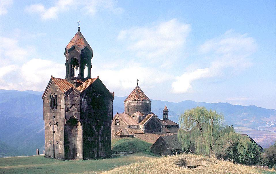 ハグバト修道院(ヴァンク)の全景 左が 1245年の鐘楼、中央が 991年創建の聖ヌシャン聖堂、右の柳の樹のうしろが 1257年のハマザスプ堂。 柳の樹の左の切妻屋根の棟が、ハマザスプ堂から後ろに突き出た小チャペル。 その左側が、わかりにくいが、小山に埋まったマテナダラン(図書室)のイェルディク の屋根。