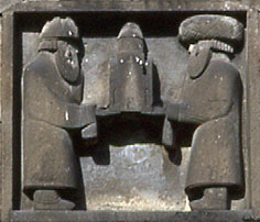 聖ヌシャン聖堂の切妻部上部に、献堂寄進の彫刻がある。
