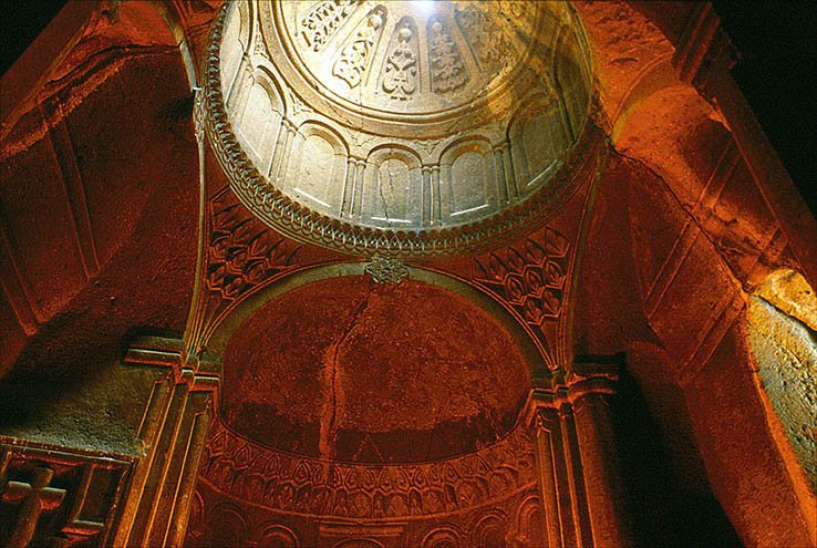 アイリ・ヴァンク(洞窟の修道院 ) プロシアン家の石窟聖堂(聖アストヴァツァツィン)、1283年 石彫ドームとドラム、ペンデンティヴもレリ-フ彫刻で満ちている。 (これも トップライトと 蝋燭の光(赤く写る)だけで撮影)