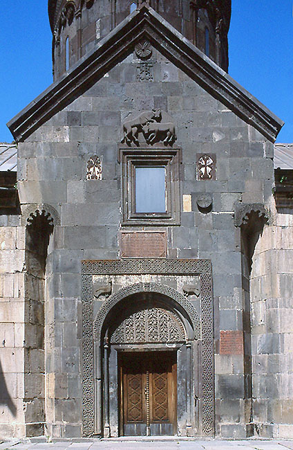 ゲガルド修道院、カトリケー(カテドラル)の南側入口のあるファサード ここが正面入口であるかのように、豊かに装飾されている。 窓の上には 争うライオンと牛、タンパンの両側上には 鳩。 左右の三角形ニッチの頂部は多弁形アーチ。