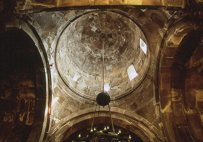 ゲガルド修道院のカトリケー(カテドラル)、天井見上げ ドームの下の円形ドラムには8つの窓があり、四隅のペンデンティヴで支えられている。 このペンデンティヴが 外側でドラムよりも出っ張るので、小屋根が必要となる。 オズーンのカトリケー などでは、スキンチで支えられた八角形のドラムである。