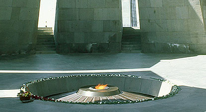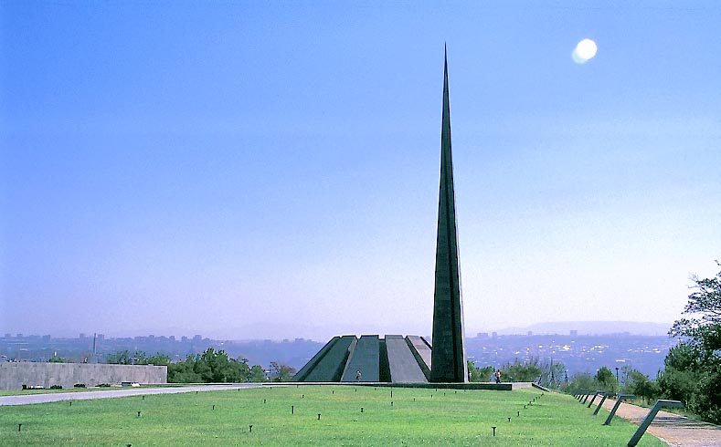 1915〜22年の オスマン・トルコによる アルメニア人虐殺の 慰霊モニュメント イェレヴァン西方の ツィツェルナカベルドの丘 Armenian Genocide Memorial, on the hill of Tsitsernakaberd, western Yerevan (Art'ur T'arkhanyan, Sashur K'salashyan) 慰霊モニュメントの中央では、絶えず慰霊の火が焚かれている。