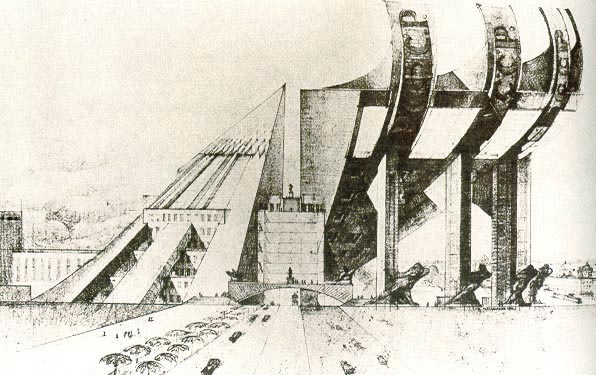 コンスタンチン・メルニコフによる「ソヴィエト・パレス」コンペ応募案、透視図, 1931年 (From "ARCHITECTURAL COMPETITIONS 1792-1949" by Cees de Jong and Erik Mattie, 1994 )