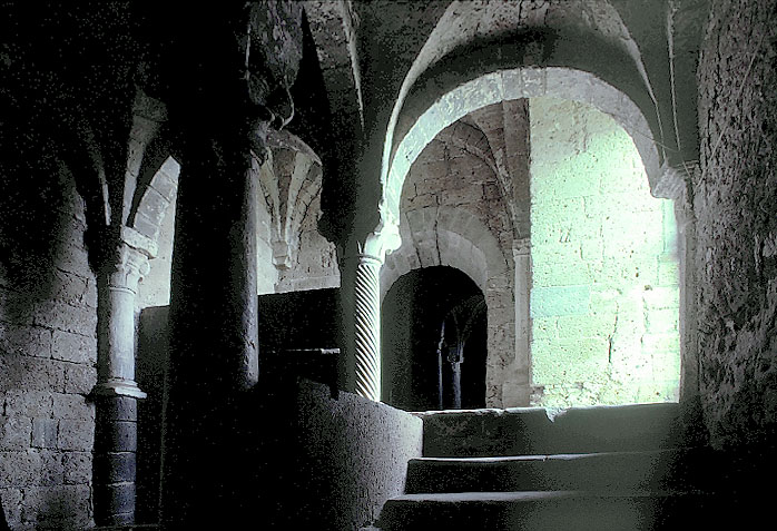 トゥスカーニャの聖ピエトロ聖堂、クリプトへの階段、11世紀 (ずっと後で気がついたが、フランコ・ゼッフィレリの映画「ロミオとジュリエット」で、 ロミオが僧に ジュリエットとの愛を告白しに行った場面で、この場所が使われていた。) Staircase to the cript of Saint Peter's Church in Tuscania