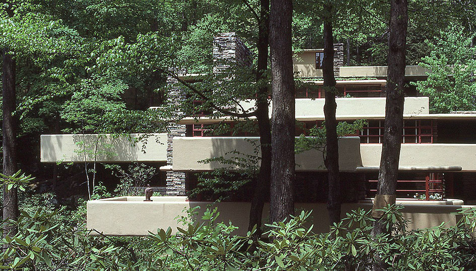 落水荘(カウフマン邸) 外観 落水荘にアプローチするにつれ、繁茂する木々の間から 積層する 無装飾のバルコニーが見えてくる。 ライトが長い休止のあとで はっきりと「近代建築」に舵を切ったように見え、 当時の世界中の建築家から 賞賛される作品となった。 一番上に見えるのが、高所のゲストハウスと そのテラス。