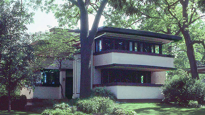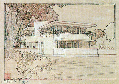 ライトが設計した、ゲイル邸、1909年 装飾が少なくなり、キャンティレヴァーのバルコニーと 庇が強調されている。 ライトが描いた透視図 左下の落款の右に 1904年とある。 ( From "Frank Lloyd Wright Drawings" 1990, Harry N. Abrams、p.24 )