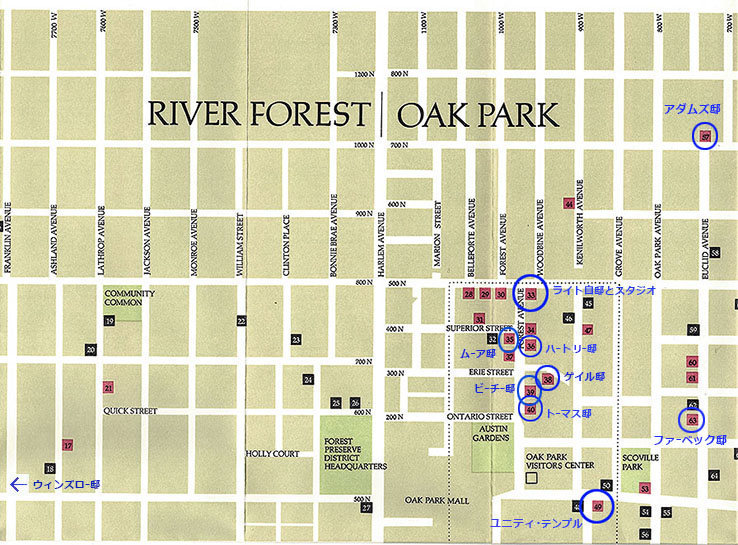 赤の番号はライトが設計した建物、黒の番号は他の建築家が設計した建物