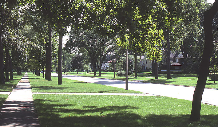 オウク・パーク村の景観(土木学会付属土木図書館の ウェブサイト より ) 村の景観の写真も 数枚撮ったはずなのに 残っていないので、借用させていただく。 ライトの頃には新興開発地だったのだろうが、100年たった今では、 木々が大きく茂り、素晴らしい田園住宅地となっている。