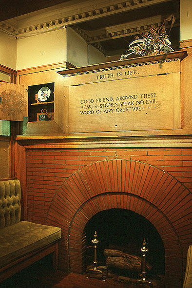 ライト自邸の 居間の暖炉 (Inglenook) 暖炉の上の壁に書かれた モットー : TRUTH IS LIFE. Good friend, around these hearth-stones speak no evil word of any creature . . . (真実こそ人生だ。この暖炉に集う仲間は、誰の陰口も言ったりしない ・・・)