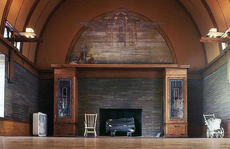 2階に ヴォールト天井のプレイルームを増築した。その暖炉の上には、ライトのデザインで