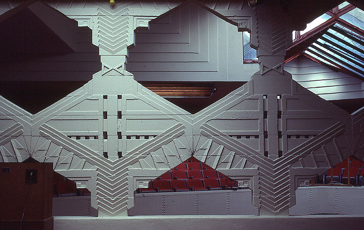 フロリダ・サザン・カレッジ ファイファー・チャペル 内部の、彫刻的コンクリート・スクリーン 切り抜かれたような「アキ」の部分が 大きすぎるような気がする。 ステンドグラスのような 繊細なデザインには ならない。
