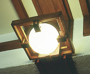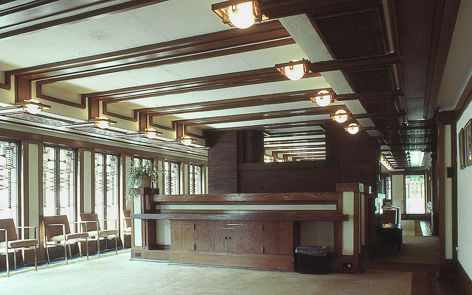 シカゴの ロビー邸の内部(食堂側) 2階の居間・食堂は 四周の窓がステンドグラスで飾られ、 連続した、きわめてモニュメンタルな空間である。 居間と食堂を分けているのは、1階からの階段と、階段に沿った暖炉。 前面に見えるのは、階段の手前に造りつけられた 食堂側の家具。 造り付けの照明器具