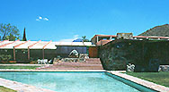 ARIZONA BILTMORE HOTEL, 1927, Phoenix アリゾナ州の州都、フィーニクス(フェニックス)に建てられたホテルで、タリアセン・ウェストを訪ねるためには、ここに宿泊することになる。しかし、ライトがこのホテルの設計にどこまで係わったのかは明らかでない。もと オウク・パークでのドラフトマンだったアルバート・C・マッカーサー(Albert Chase McArthur)が独立して請けた仕事で、ライトのカリフォルニアでのテキスタイル・ブロックの仕事を受け継ぐために、1928年にライトに「設計アドヴァイザー」になってもらったのだと言う。 ライトはその年、再婚相手のオルギヴァンナと二人の娘(スヴェトラーナとイオヴァンナ)を連れて、初めてアリゾナを訪れ、冬から夏にかけて半年を 砂漠の地に滞在した。 ホテルの骨子は 帝国ホテルを経験したライトの指導のもとに設計されたが、当然 すべてを意のままにはできなかったので、ライトはこのホテルのデザインに あまり満足しなかったらしい。それでも 安い材料を用いて、長大なロビーやレストラン、バーなど、高級ホテルに近い質を実現したとは言えるし、カリフォルニアでのテキスタイル・ブロックの構法、仕上げをここに適用することもできた。そして、当時 ウィスコンシンで四面楚歌だったライトとオルギヴァンナ夫人は、この仕事でやっと一息つけたのだった。これを機会にライトは、北の寒冷なウィスコンシンとは まるで違った 砂漠の風土に 耽溺していくのである。