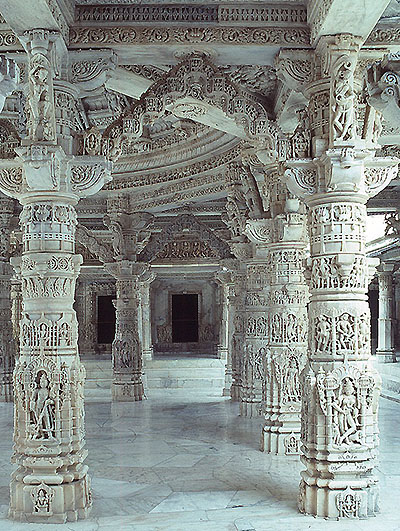 < 比較参考 > アーブ山のデルワーラ寺院群のうち、ヴィマラ寺院のマンダパ エニス邸のインテリアを見た時、私にはインドのジャイナ教の寺院が 思い出されてならなかった。 白大理石とコンクリートという違いはあるが、 細かな彫刻で満ちた柱や壁の連なりは、両者に きわめて似た印象をもたらす。