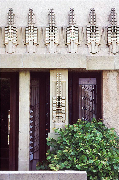 バーンズドール邸(ホリホック・ハウス)の外壁装飾と窓まわり。