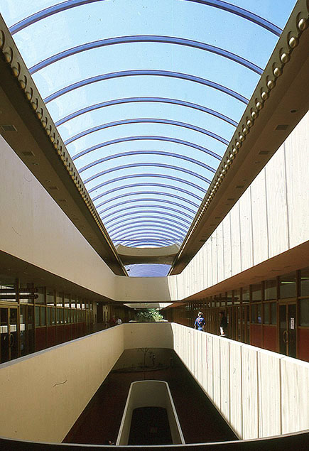 マリン郡庁舎( シヴィック・センター ) どちらの棟にも 中廊下に吹抜けがあり、 アクリルのヴォールト屋根から光が落ちる。 ライトは 屋根のない外部空間として計画したが、 ライトの没後に アクリルの天窓に変更された。