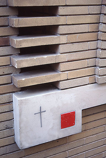 外壁、入口アーチ 左下部の詳細。 赤いのは、ライトのサイン入り磁器タイル埋め込み。