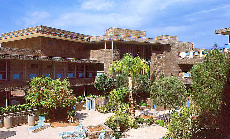 多くの建物が建っていて、テキスタイル・ブロックが用いられている。