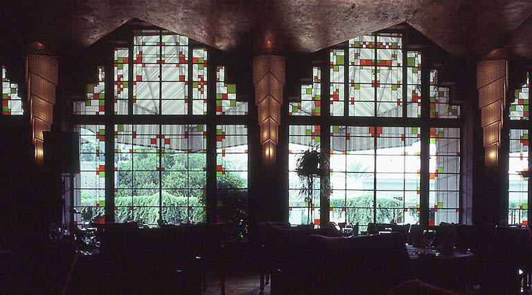 レストランのステンドグラス窓、ライトのデザインとは言いがたい。