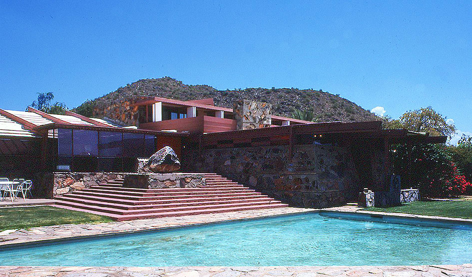 タリアセン・ウェストの三角池と左の製図室棟