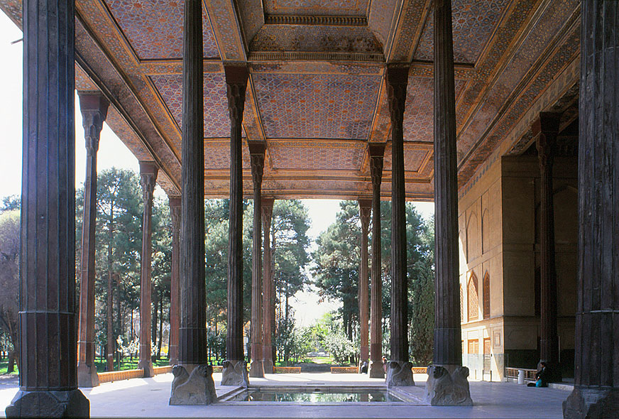 チェヘル・ソトゥーン宮殿(四十柱殿)、イスファハーン(イラン)1647年 木造のターラール、天井の彩色は、当初は派手だったのかもしれないが、今は渋い。 Talar of Chehel Sotun Palace in Isfahan, Iran, 1647