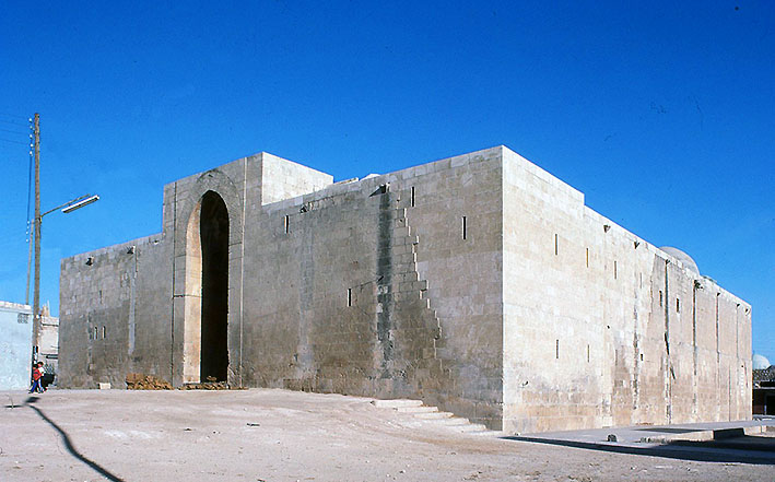 アレッポの ザーヒリーヤ学院、1220年、シリア 何の飾りもない石の壁で囲われている。 電柱の下の2人の子供で、スケールがわかる。 Zahiriya Madrasa in Aleppo, Syria, 1220