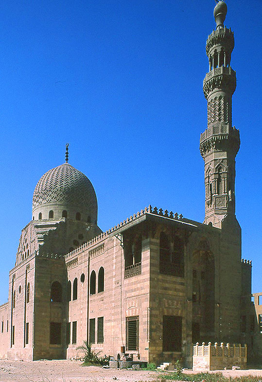 カイロの アミ-ル・クルクマス廟+モスク+宿泊所の複合体(エジプト)1507年 手前の角の部分がサビール・クッターブ(給水所と寺子屋)、右が ミナレット、 その奥が モスクで、一番奥のドーム屋根が クルクマス廟。