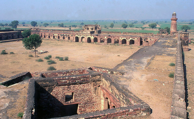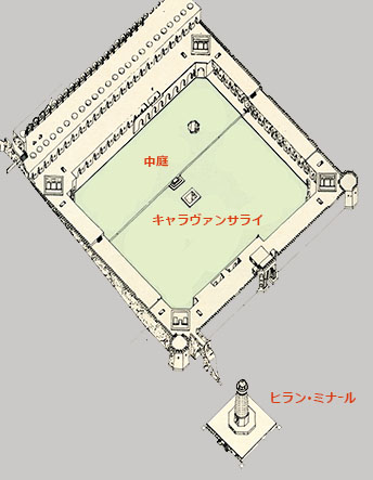 ファテプル・シークリーの、壮大な規模の 王立キャラヴァンサライの遺跡、16世紀(インド) 右奥に ヒラン・ミナール(ミナレット)が見える。 王立キャラヴァンサライと ヒラン・ミナールのアイソメ図 (From Marg "Fatehpur-Sikri", 1985)