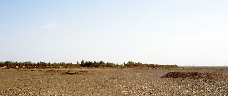 カレーズ(カナート)の竪穴群、トルファン(中国) 左奥から 右手前方へ(山の麓から都市へ)一列に土盛りが並んでいる。 カレーズ(カナート)の掘削と通気のための竪穴群だが、空から見ないと わからない。 穴の周囲には 土盛りをして、ゴミの入るのを防ぐ。
