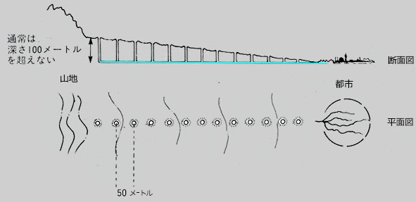 カナートの図式的な平面図と断面図 (ジョン・ブルックス『楽園のデザイン』鹿島出版会 より)