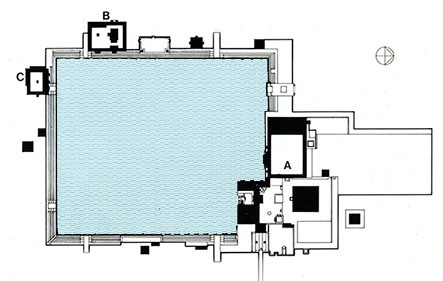 サルケジのタンク 平面図 A:マフムード・ベガラ廟やモスクの複合体 B:ムハンマド・シャーの宮殿 C:宮殿 (From "Ahmadabad" 1988, Marg Publications)