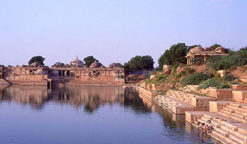 階段で囲まれたサルケジのタンク、夕景、15〜16世紀(インド) アフマダーバードの西10km、タンクの大きさは 約200m×250m。 正面が マフムード・ベガラ廟、その左側に大モスクがある。