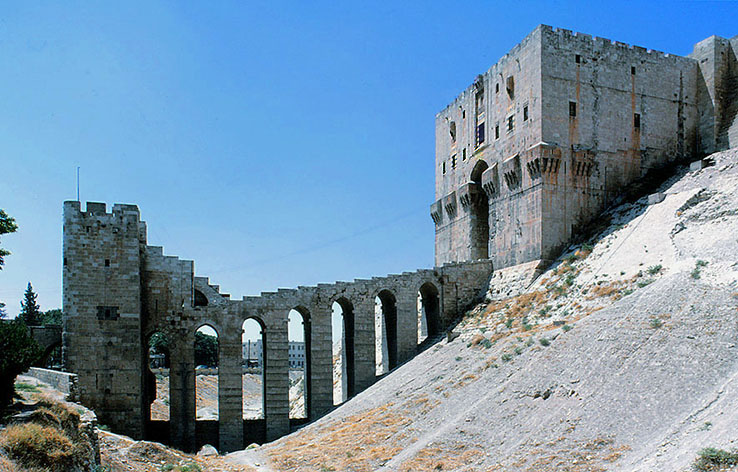 アレッポの城塞。 城塞の丘の周囲に 濠がまわり(今は水が無いが)、城内に行くには 橋を渡る。 橋の入口の稜堡は 1211年に創建、16世紀に20メートルの高さに再建された。 右側の雄大な門の上階には宮殿の大ホールがある。