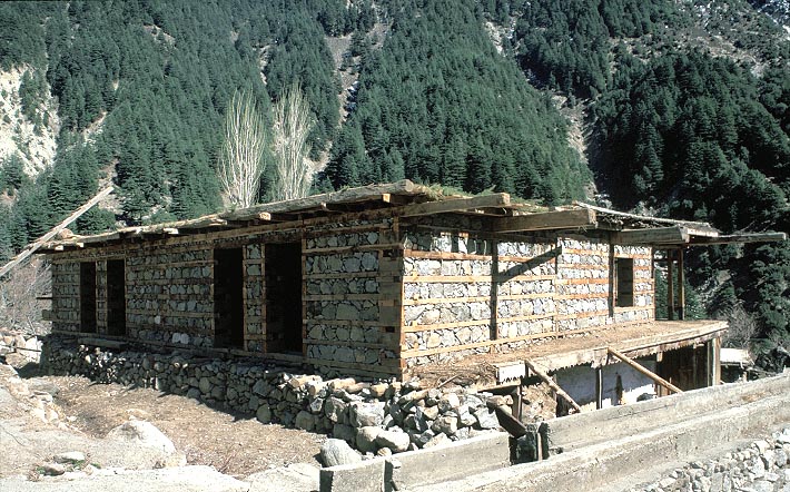 上 スワート地方の典型的な民家、石と木を交互に積み重ねた壁面