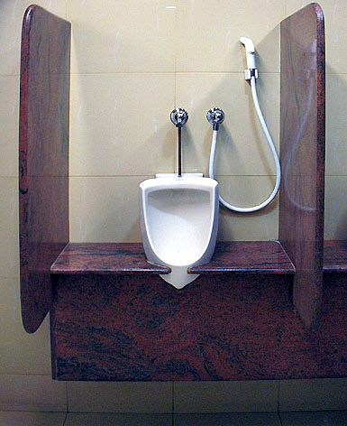 カラチ国際空港のトイレにおける、赤御影石によるカウンター式の小便器と、シャワー水栓。