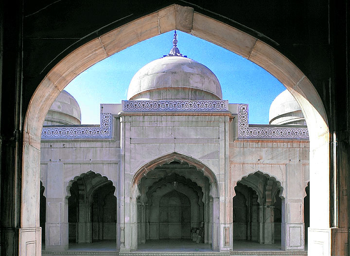 ラホール城内の宮廷礼拝堂、真珠モスク(モティ・マスジド)、1654年。 中庭が小さいので、全体の写真を撮るための引きがとれない。 パラペットのタイル以外に、ほとんど装飾がなく、チャトリもない、 禁欲的なモスクである。