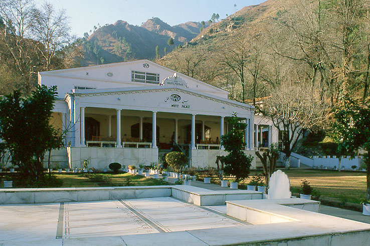 避暑地のマルガザールにある ホワイト・パレス・ホテルの本館 庭園内の手前に設けられたのは、白大理石の野天の小モスク 少人数用のイードガーだろうか。 床にはカーペットのかわりに 一人ずつの座が象嵌されている。 右端に立っているのが ミフラーブの奥板。