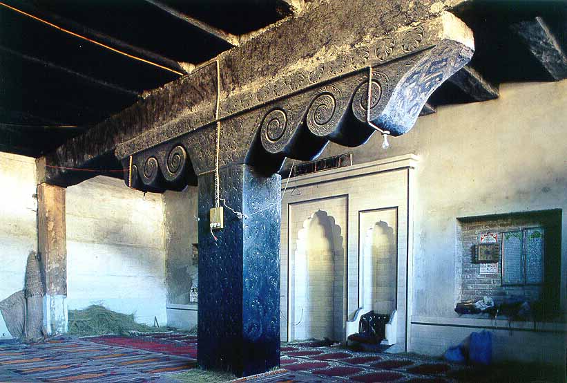 中央に巨大な木柱が立つピシュマールのモスクの礼拝室内部、右奥がミフラーブとミンバル
