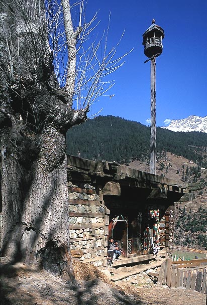 木と石が交互に積まれた ピシュマールのモスクとミナレット