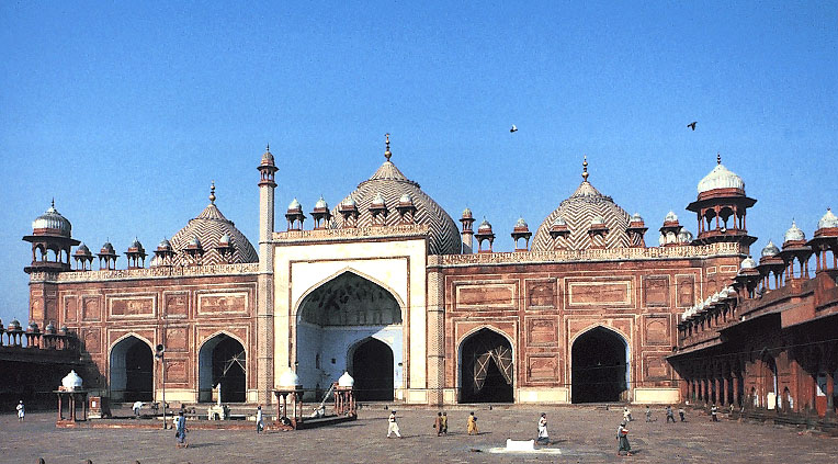 アーグラの 金曜モスク(ジャーミ・マスジド)、1648年。 ムガル朝の 4大モスクのひとつで、 シャー・ジャハーン帝の娘の名を冠して、ジャハーン・アラー・モスクとも呼ばれた。 ミナレットがなく、東側の回廊は英軍によって破壊された。 3連ドームの山形模様が印象的。
