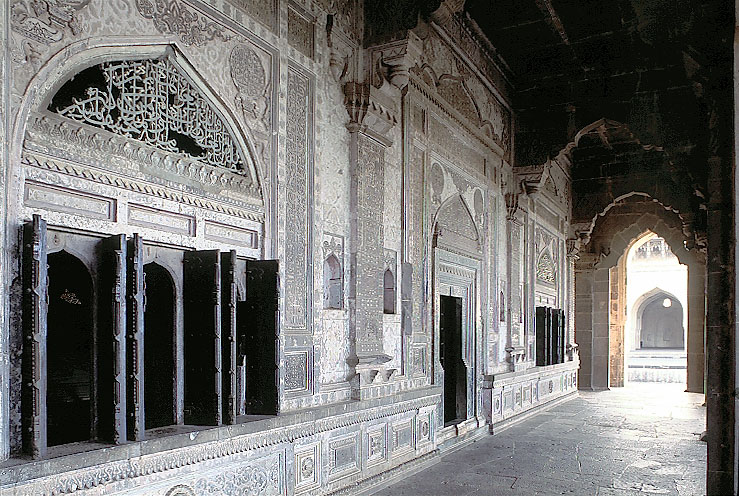 イブラーヒーム・ラウザの周囲を二重にめぐる、木造的な架構の柱廊内部。 石造の壁面は繊細な彫刻が全面にほどこされ、開口部には木製の扉がつけられている。 この内部は大スパンの墓室で、その 2階にドーム屋根のホールがある。
