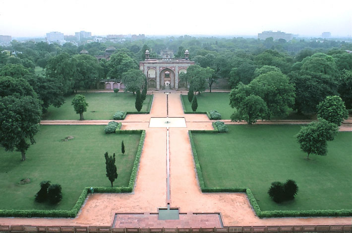 デリーのフマユーン廟の屋上から、広大な庭園のエントランス側を見る。