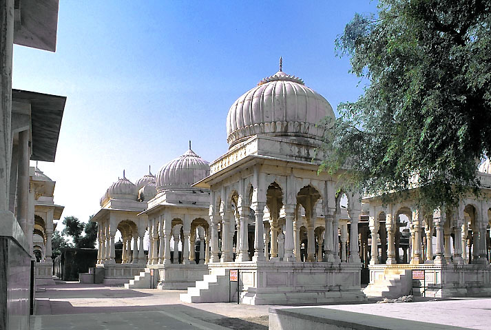 デヴィ・クンドの王室墓園における チャトリー群、主に 18世紀、ビーカーネル それぞれ 12本の柱にドーム屋根をかけた 白大理石の王侯の廟が無数に並ぶ。 庇(チャッジャ)の出が小さいので、造形的にはずんぐりした感がある。
